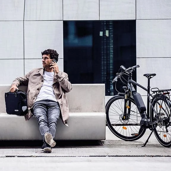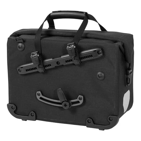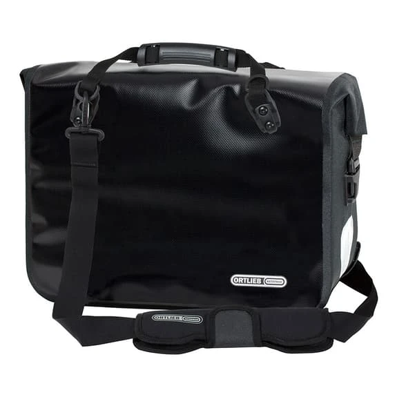 The 21 litre Ortlieb Office-Bag with Quick-Lock2.1 adapter can be attached to the left or right of the luggage rack and can be attached and released very quickly. Thanks to the removable, padded shoulder strap, you can take the Office-Bag with you when you leave your bike parked and make your way to the office. Two high-gloss reflectors made of 3M Scotchlite material ensure good visibility in low light conditions. It has a roll-up closing system and its interior is as simple and well-structured as its exterior. It offers a padded compartment for notebooks up to 15.4 inches and enough space for two DIN A4 folders, pens, mobile and so on. This shoulder strap is made of polyester fabric coated with PU (polyurethane) and is PVC-free (polyvinyl chloride), resulting in a robust and waterproof canvas material that offers long-lasting high quality and which respects the environment.