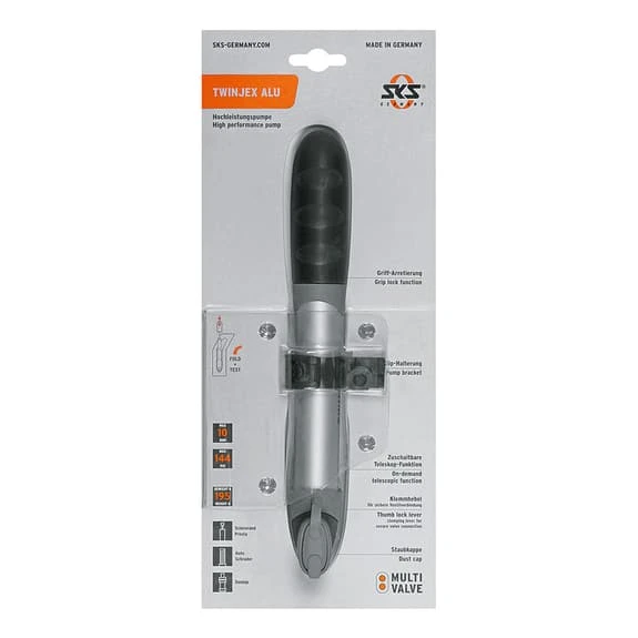The SKS Twinjex Alu manual pump is a top-level compact mtb pump with Multi Valve Head for all valves. Maximum volume per stroke makes the Injex the right choice for mountain bikers. Rubber inserts guarantee comfort and grip. The telescopic pumps allow a maximum output of 140 PSI due to the high pressure mode (locking of outer tube).