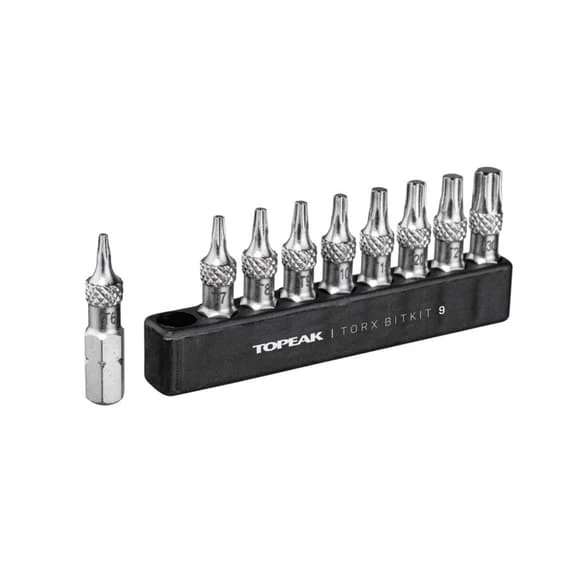 The Torx BitKit 9 Bit Set is a complete 9-piece Torx bit set for road and mountain bike repair and maintenance. It is designed to work with all Topeak ratchets and torque wrenches, as well as other brands’ ratchets and bit drivers. The generous 30 mm bit length makes it easy to reach tough bolt locations and knurling prevents fumbling when changing bits or removing bits from the organiser.