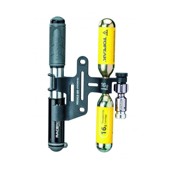 The Topeak Tri-BackUp CO2 support and hand pump is a complete system that Topeak has carefully integrated storage, hydration and repair into a single solution for triathletes. Tri-BackUp is an adapter for mounting a CO2 inflator, CO2 cartridges and a mini pump.