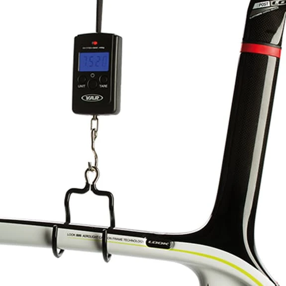 Hanging and compact digital scale for weighing with precision +/- 10g bicycles, frames and components, with a capacity of up to 40 kg. from 10 gr It hangs easily on a hook or installed in the jaw of a repair foot by a cord. It includes a hook to hang the bicycles covered with vinyl to protect them.