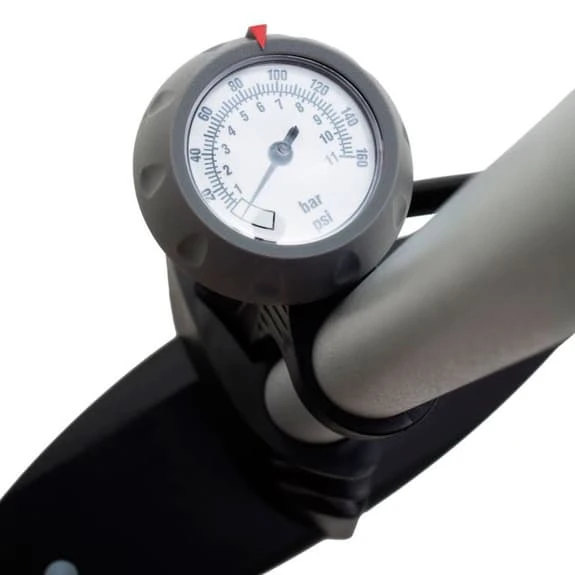 The VAR workshop pump with 160 psi / 11 bar pressure gauge has an ergonomic and robust design. Its steel body is fixed firmly to the base of the pump, has a precision gauge and fits Presta, Schrader and Dunlop.