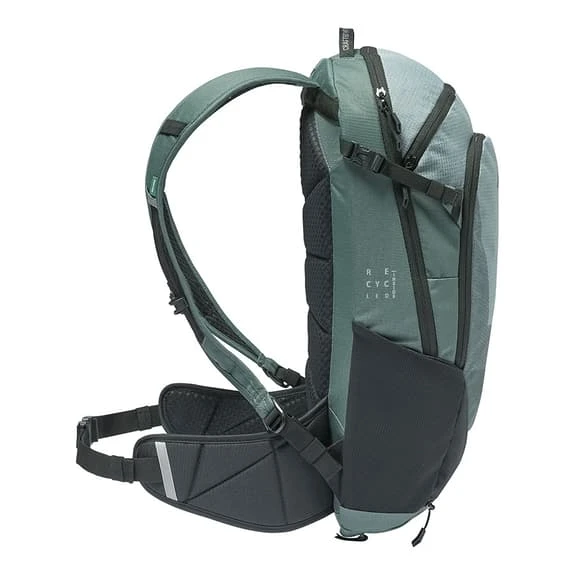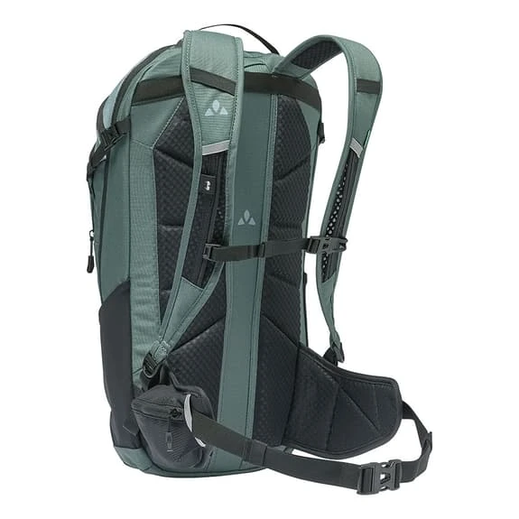 The Vaude Moab II backpack, with 15 liters of volume, is designed to carry your essential gear safely while pedaling the most technical trails. The optimised Ventex Active suspension system ensures a perfect fit and good ventilation, with thicker padding in the lumbar area to relieve pressure points. The comfortable hip belt pulls the backpack’s center of gravity towards the back and, together with the Ergoshape shoulder straps, ensures a perfect fit with optimal freedom of movement for cycling. The backpack is divided into three compartments to organize all the equipment without problems. There is an interior zippered pocket for your valuables in front of the main compartment, where you can store your waterproof clothing and power supply. It has a specific compartment for tools. The helmet holder can be stored neatly at the front. One of the compartments is optimised to accommodate hydration systems. The recycled material of the bluesign-certified Moab 15 is processed with the environmentally friendly, water-repellent Eco Finish treatment without the use of fluorocarbons (PFCs).