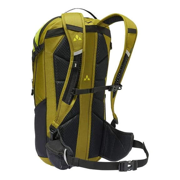 The Vaude Moab II backpack, with 15 liters of volume, is designed to carry your essential gear safely while pedaling the most technical trails. The optimised Ventex Active suspension system ensures a perfect fit and good ventilation, with thicker padding in the lumbar area to relieve pressure points. The comfortable hip belt pulls the backpack’s center of gravity towards the back and, together with the Ergoshape shoulder straps, ensures a perfect fit with optimal freedom of movement for cycling. The backpack is divided into three compartments to organize all the equipment without problems. There is an interior zippered pocket for your valuables in front of the main compartment, where you can store your waterproof clothing and power supply. It has a specific compartment for tools. The helmet holder can be stored neatly at the front. One of the compartments is optimised to accommodate hydration systems. The recycled material of the bluesign-certified Moab 15 is processed with the environmentally friendly, water-repellent Eco Finish treatment without the use of fluorocarbons (PFCs).