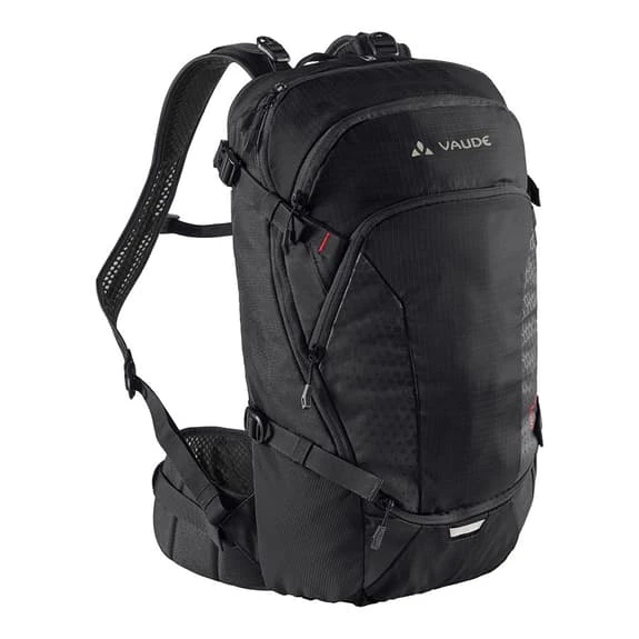 The Vaude Moab Pro II backpack, with a 16-litre capacity, is designed for mountain biking. In addition to its large capacity, this backpack has a back protector and an ergonomic suspension system to cushion the impacts that occur during sports practice on forest tracks and trails. The organizer located in the main compartment allows you to keep your items in order, preventing them from moving around uncontrollably while pedalling. This product is made with Eco Finish, an environmentally friendly, fluorocarbon free, water repellent (PFC free) finish. The Vaude Green Shape label is synonymous with ecological and functional products made from sustainable materials.